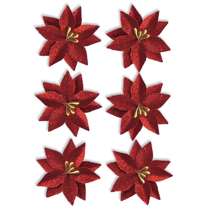 Червена Блестяща Коледна Звезда - Хартиени Цветя, 6 Броя, 3.5 - 4 см