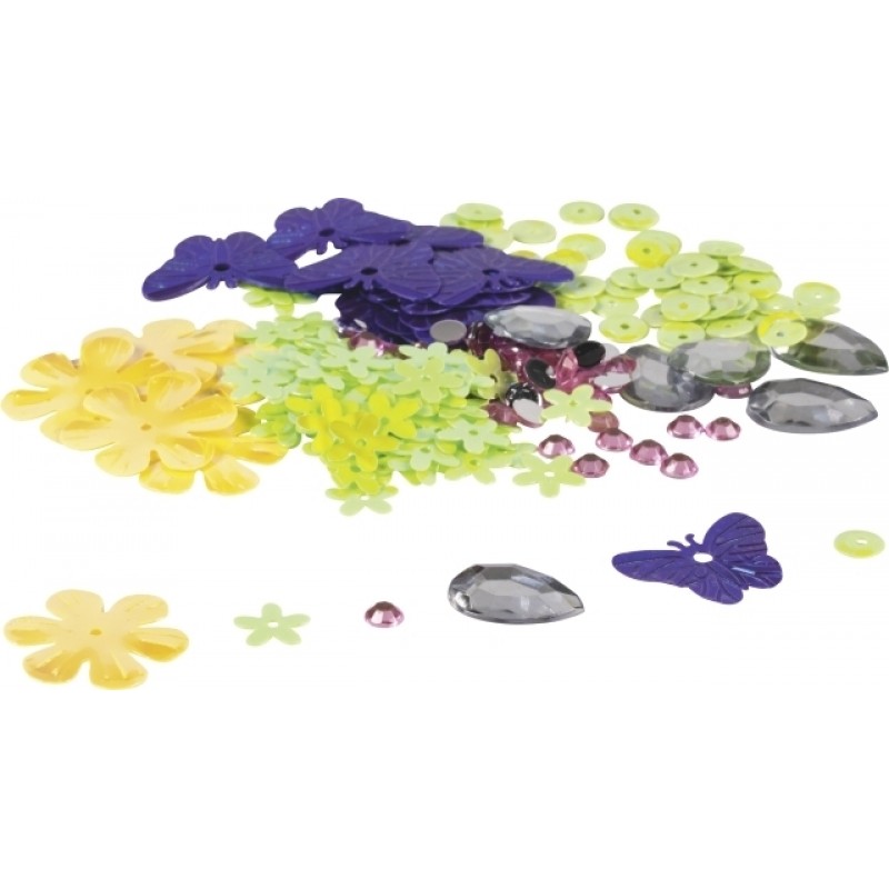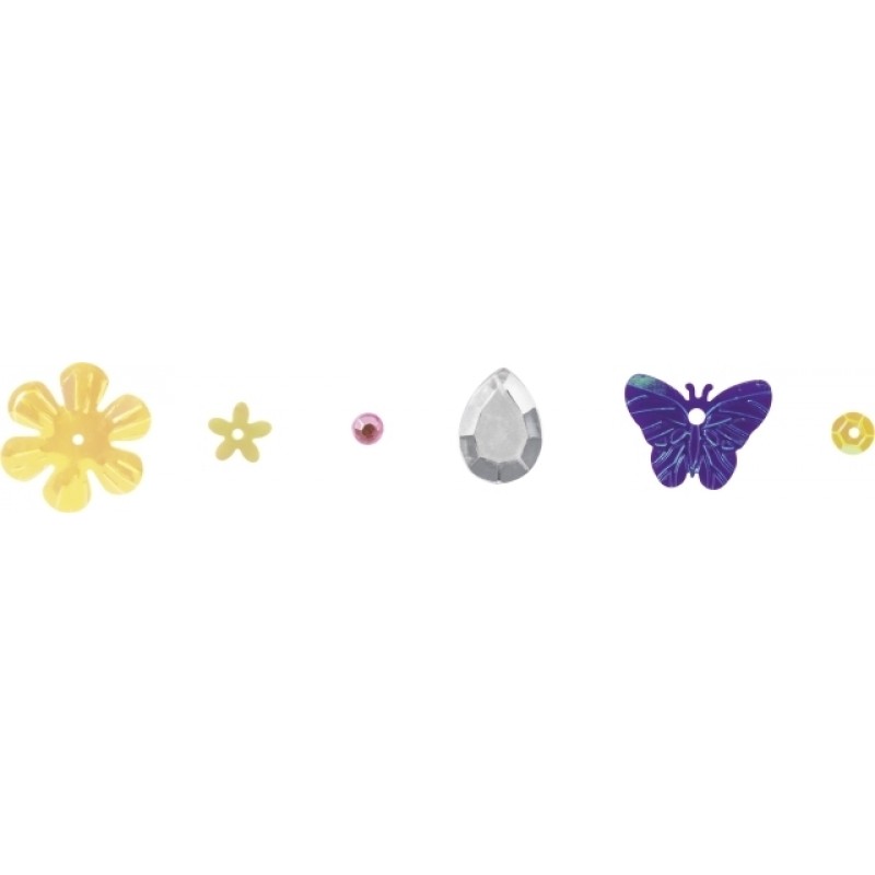 Комплекта съдържа шест различни вида мъниста и пайети - кристални капки, пайети, цветчета и пеперуди.